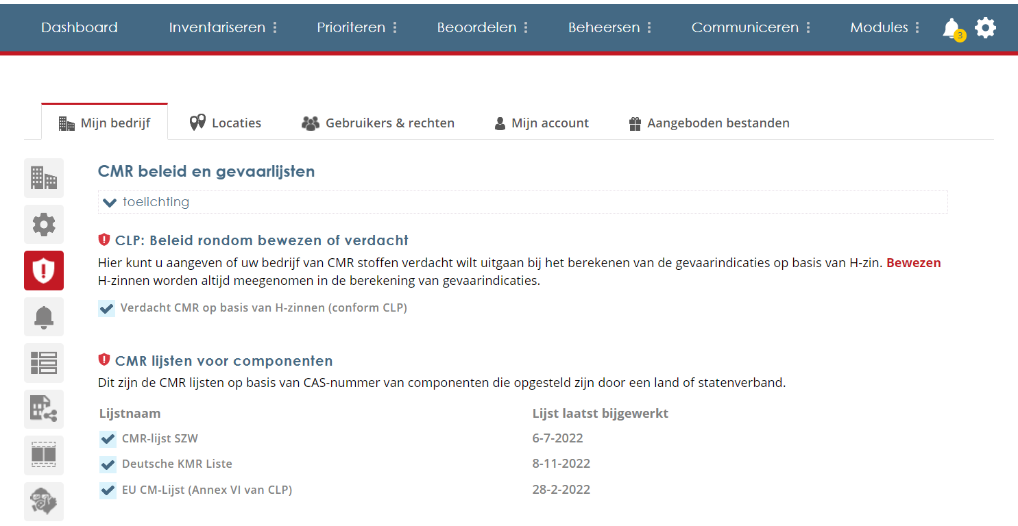 Voordat u aan de slag gaat met het bekijken van uw CMR-stoffen is het handig eerst bij het tandwieltje de instellingen klaar te maken. Ga daarvoor in het Premium account naar het tandwieltje > Mijn Bedrijf > CMR-beleid en gevaarlijsten. Als u geen Premium account heeft gaat u naar Mijn account > CMR-beleid en gevaarlijsten (u heeft daar beperkte instellingen).