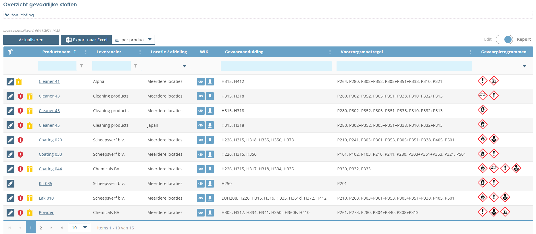 In Stoffenmanager® kun je de gevaarlijke stoffen binnen je bedrijf inventariseren. Je vult hierbij de belangrijkste informatie in, zoals H-zinnen, gevaarlijke bestanddelen (componenten) en gevaarpictogrammen. Het kolommenoverzicht in Stoffenmanager® kun je naar eigen wens samenstellen.