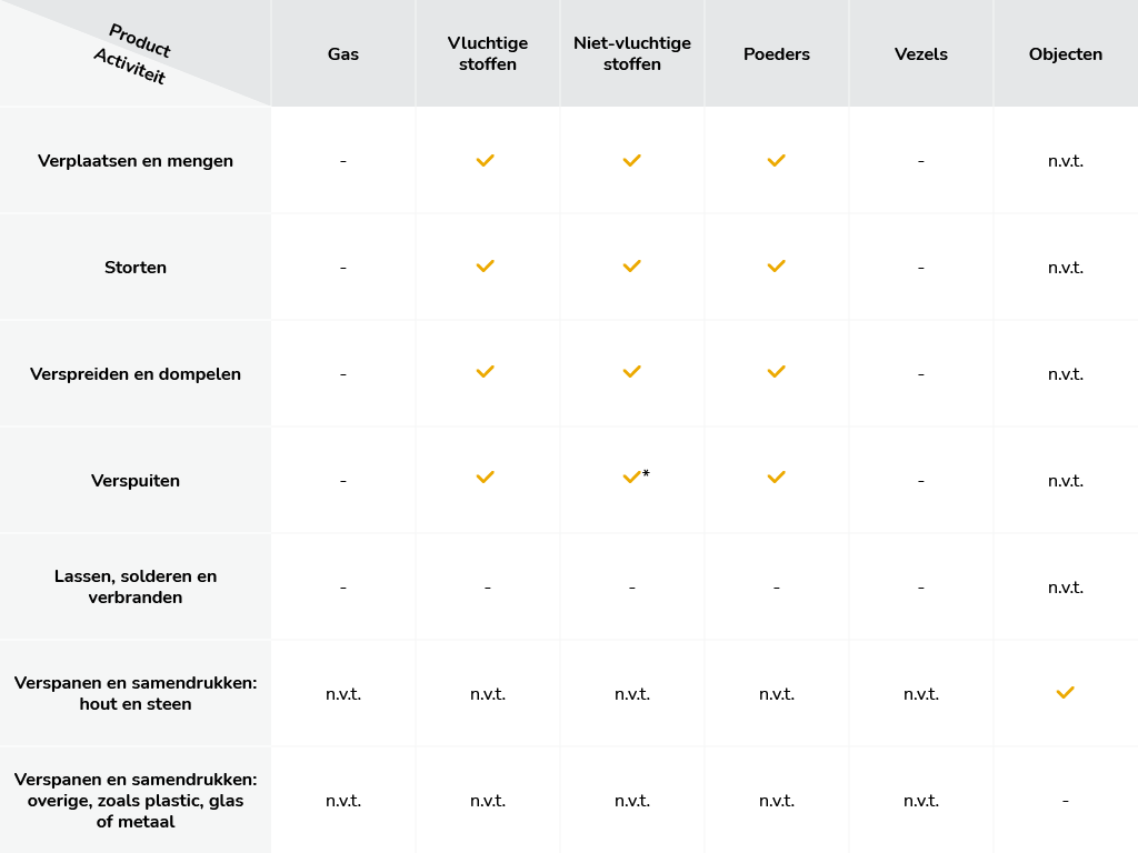 - ✓ Blootstelling aan inhaleerbaar stof (poeders, verspanend hout/steen) en respirabel stof (enkel verspanend steen) kan in Stoffenmanager® worden beoordeeld.